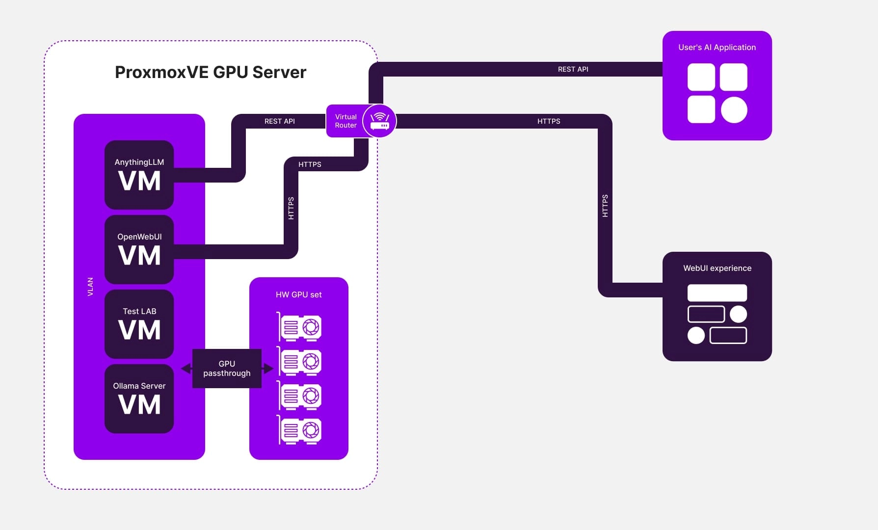 - Installation von Sprachmodell-Servern: Die Sprachmodell-Server Ollama und OpenWebUI wurden auf den virtuellen Maschinen installiert, zusammen mit einem Server, der Zugang zu einer benutzerfreundlichen und sicheren Web-UI für die Verwaltung der Sprachmodelle bot, wie z. B. AnythingLLM. AnythingLLM bot auch API-Zugang für die Integration mit anderen Client-Entwicklungen.