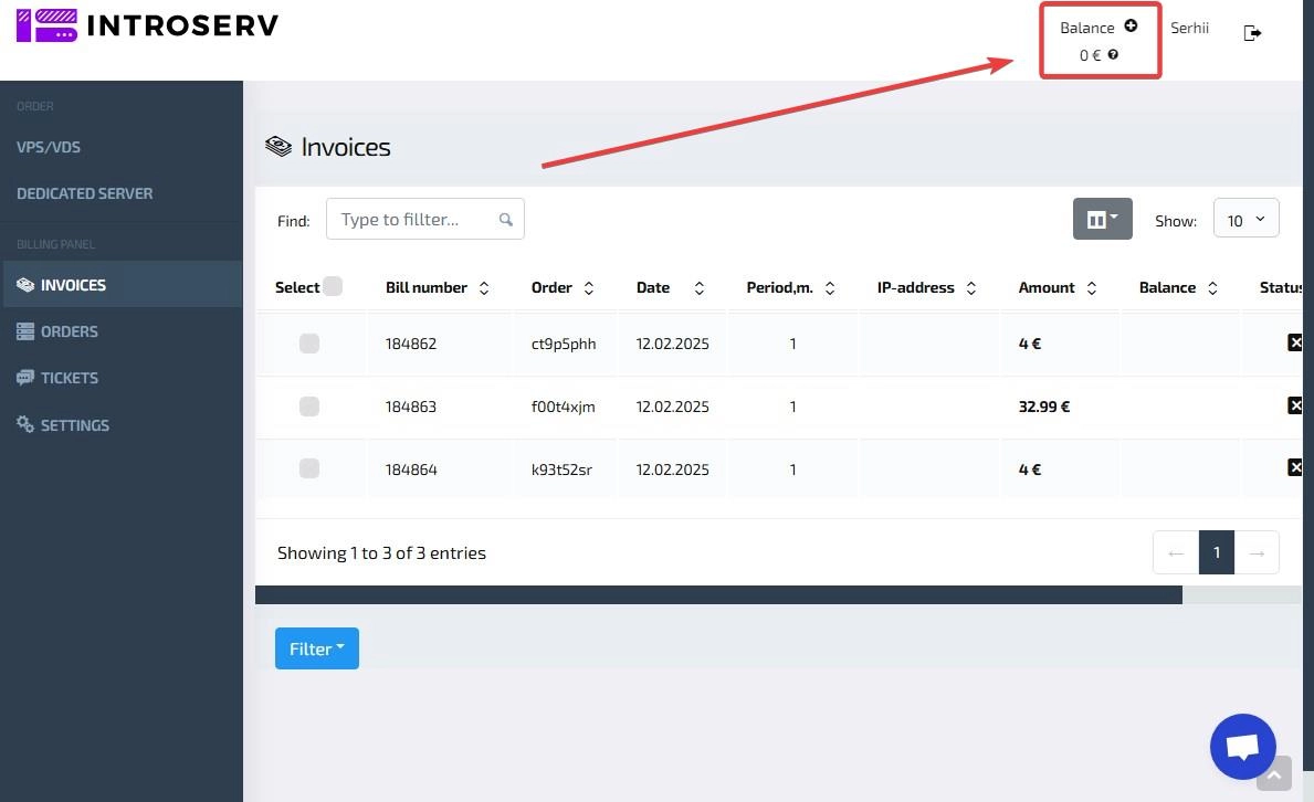 Mit einem Guthaben auf Ihrem Konto können Sie im Voraus bezahlen und dieses Guthaben zur Bezahlung beliebiger INTROSERV-Dienste verwenden - einschließlich dedizierter Server, VPS, Lizenzen, IP-Adressen und mehr. Es ist besonders nützlich für wiederkehrende Zahlungen mit aktivierter automatischer Verlängerung: das System zieht automatisch Geld von Ihrem Guthaben ab, ohne jedes Mal eine manuelle Bestätigung zu verlangen.