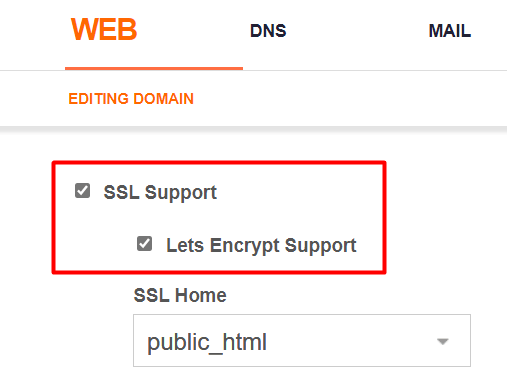 - Wenn das Zertifikat nicht im Voraus erworben wurde, können Sie einfach das Kontrollkästchen"Let's Encrypt Support" anklicken. In diesem Fall wird automatisch ein kostenloses Zertifikat generiert, das dann automatisch erneuert wird.