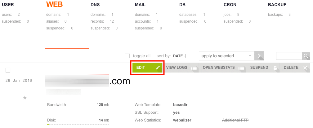 - Gehen Sie zunächst auf die Registerkarte WEB und klicken Sie auf die Schaltfläche "Bearbeiten" / "EDIT" für die Domain, die SSL benötigt.