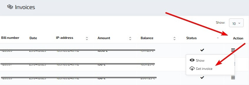 In the list of paid bills choose the necessary one. In the "Action" submenu, select "Get invoice".