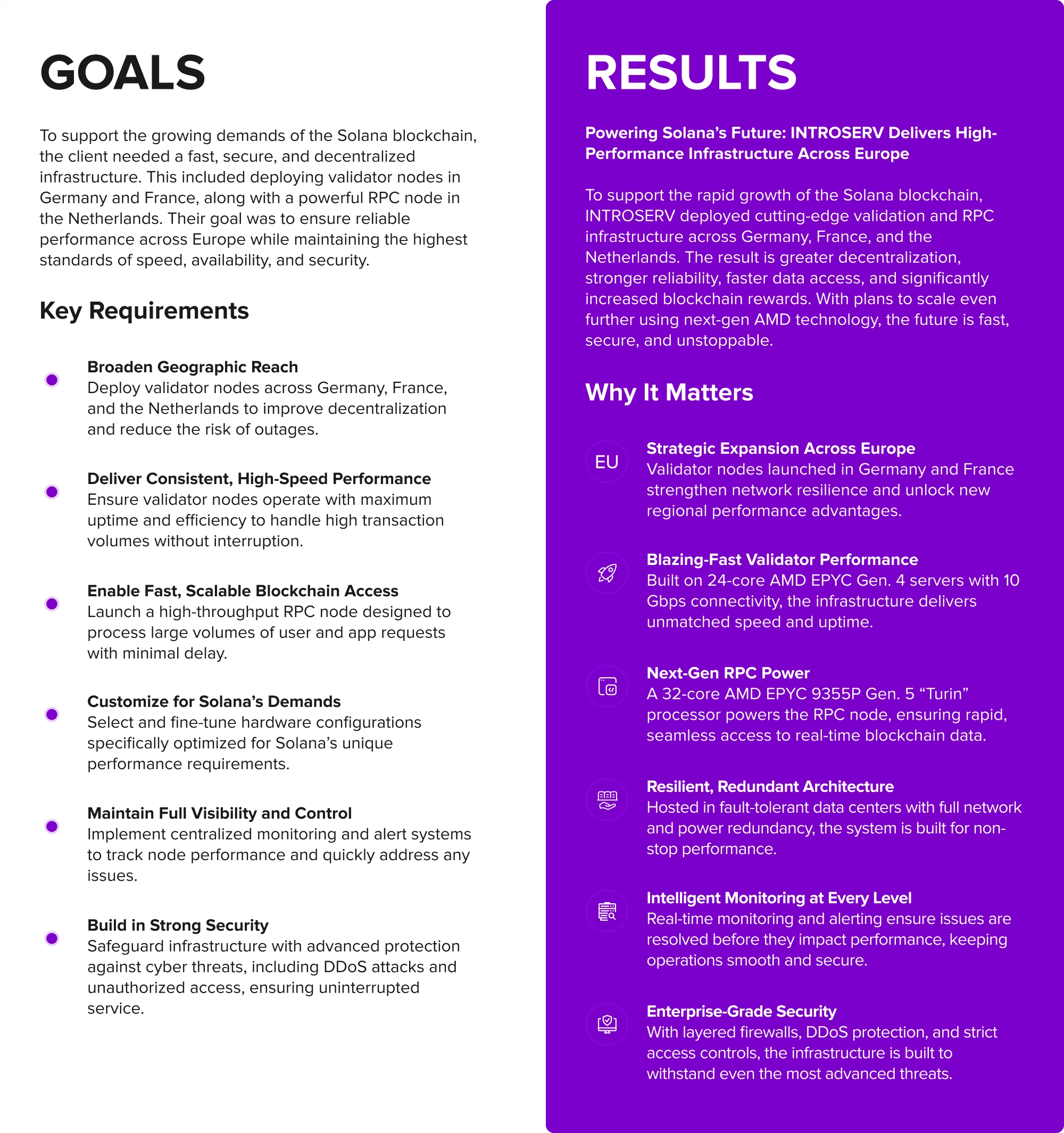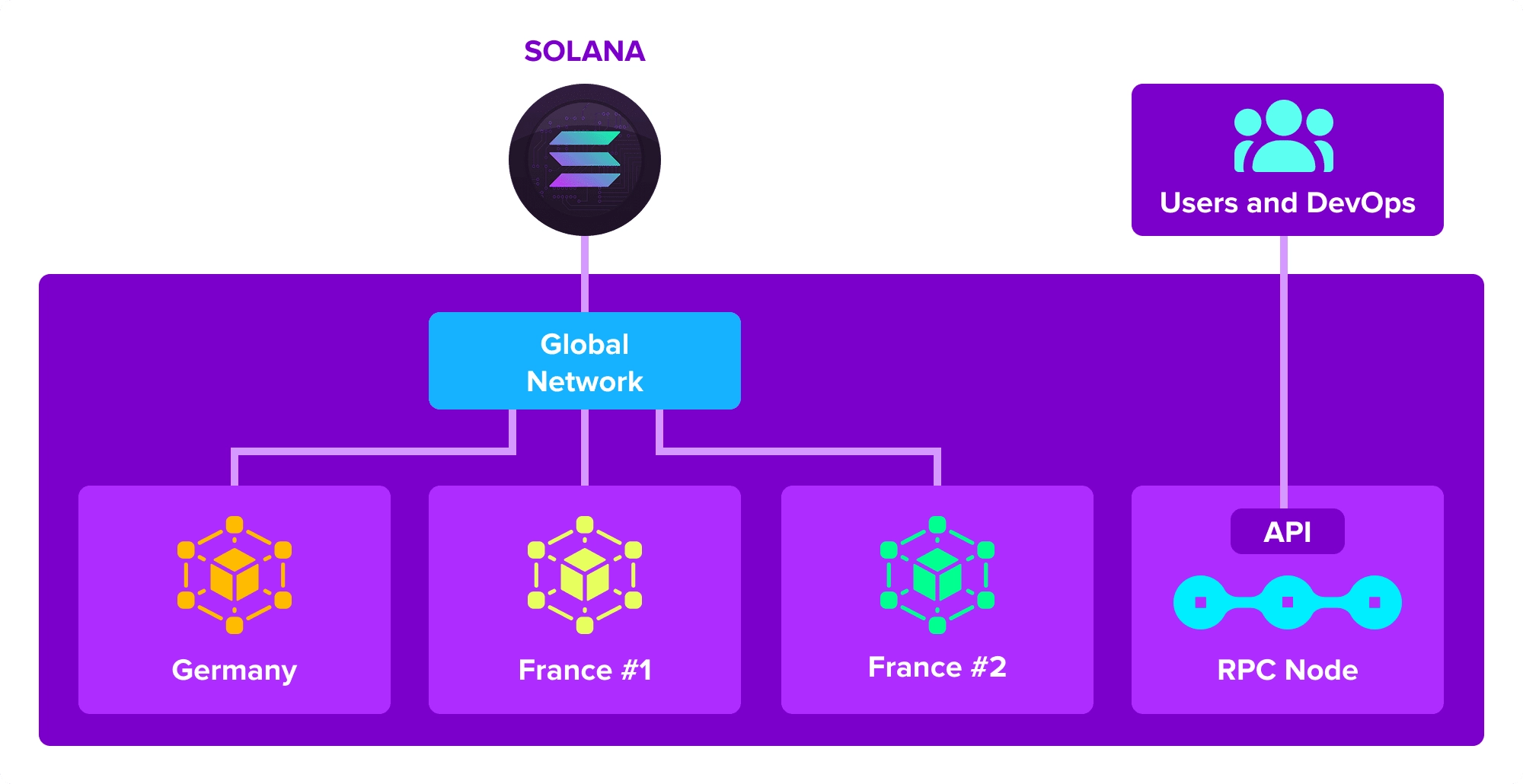 La creciente demanda de aplicaciones descentralizadas y el alto rendimiento de blockchain Solana requieren una infraestructura de validadores fiable y geográficamente distribuida. Proporcionar descentralización y tolerancia a fallos es fundamental para la estabilidad de la red. El cliente desea ampliar su red Solana desplegando nodos de validación adicionales en regiones estratégicamente importantes de Europa. Además, su equipo de desarrollo necesitaba un nodo RPC independiente para garantizar una recuperación de datos de blockchain rápida y fiable.