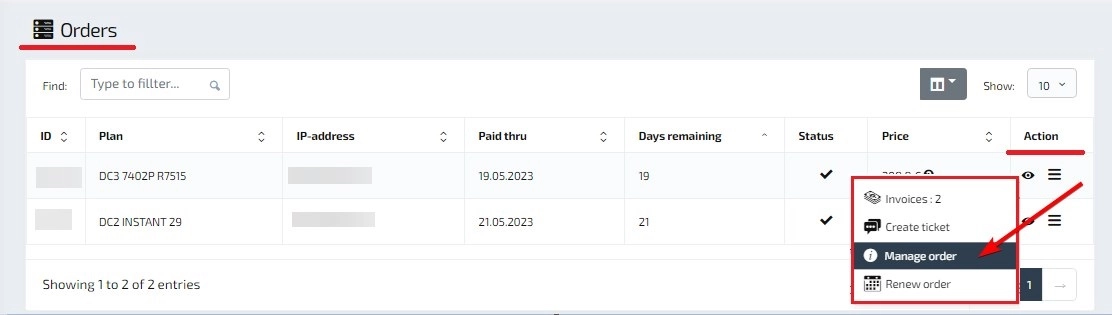 Allez dans l'onglet "Commandes", puis dans le sous-menu "Actions" de la commande souhaitée, sélectionnez "Gérer la commande".