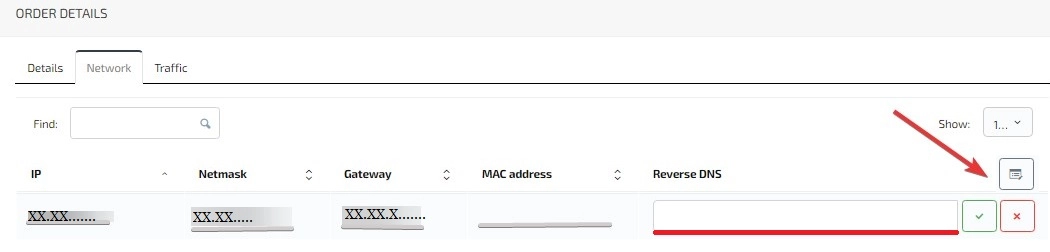 Cliquez sur l'icône d'édition à côté de l'adresse IP souhaitée, puis le champ DNS inversé devient disponible pour l'édition.