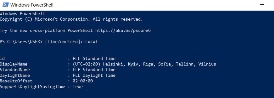 Pour déterminer le fuseau horaire actuel dans la console PowerShell, utilisez l'une des commandes suivantes :