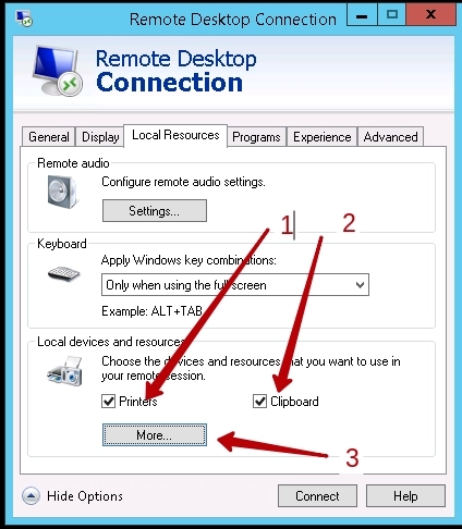 - le transfert d'imprimante (si la case est cochée, les imprimantes connectées localement seront disponibles sur le bureau distant)