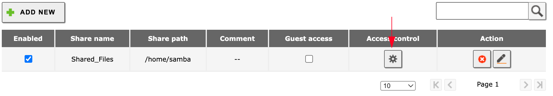 Etape 4 : Définir les permissions (ACL) : Dans la liste des partages, cliquez sur l'icône Contrôle d'accès.