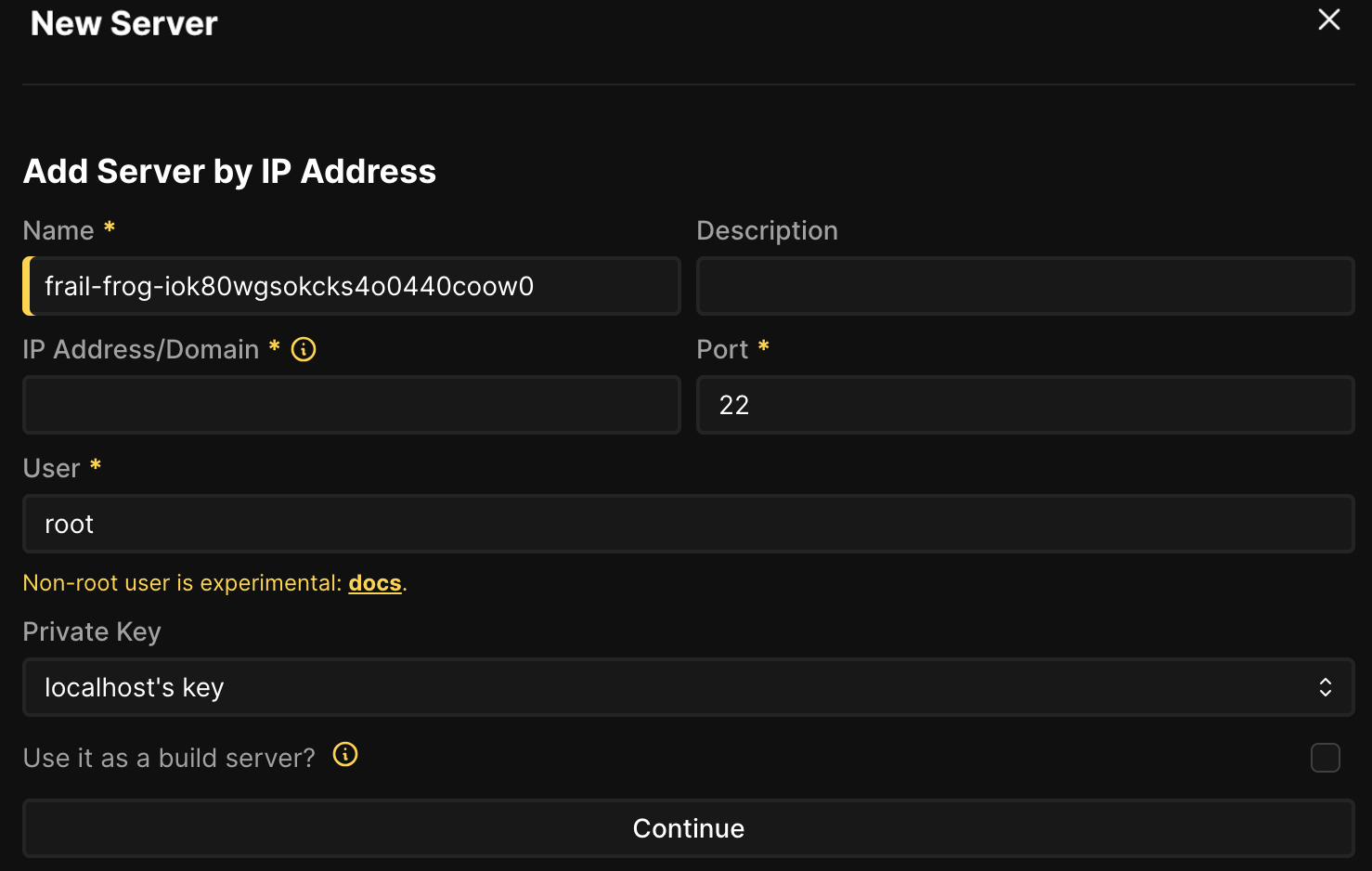 Coolify prozor za dodavanje novog servera