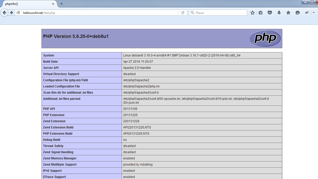 Sada otvorite vezu helloworld.net/test.php u pregledniku. Dobit ćete sljedeću sliku.
