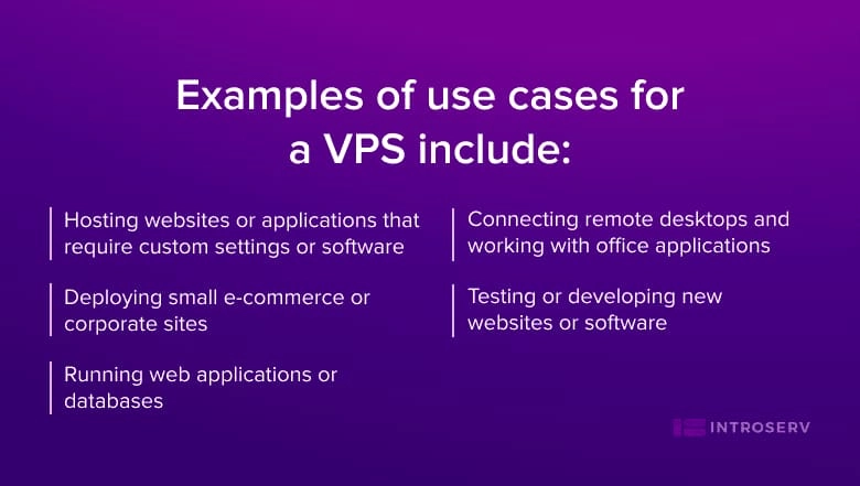 Ova vrsta poslužitelja u oblaku idealna je za mala i srednja poduzeća ili web stranice koje zahtijevaju više kontrole i fleksibilnosti od plana dijeljenog hostinga, ali ne trebaju potpune resurse ili sigurnost namjenskog uređaja. Neki primjeri upotrebe za VPS uključuju: 1. Hosting web stranica ili aplikacija koje zahtijevaju prilagođene postavke ili softver 2. Povezivanje udaljenih radnih površina i rad s uredskim aplikacijama 3. Postavljanje manjih e-commerce ili korporativnih stranica 4. Testiranje ili razvoj novih web stranica ili softvera 5. Pokretanje web aplikacija ili baza podataka