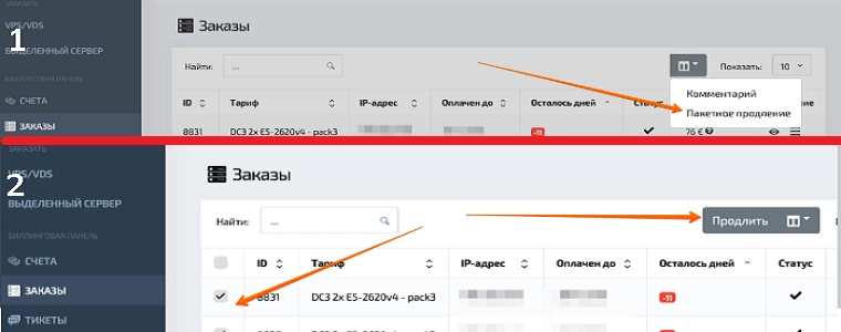 - U odjeljku "Narudžbe", odaberite "Grupna Produženja" i provjerite okvire pored potrebnih servera.