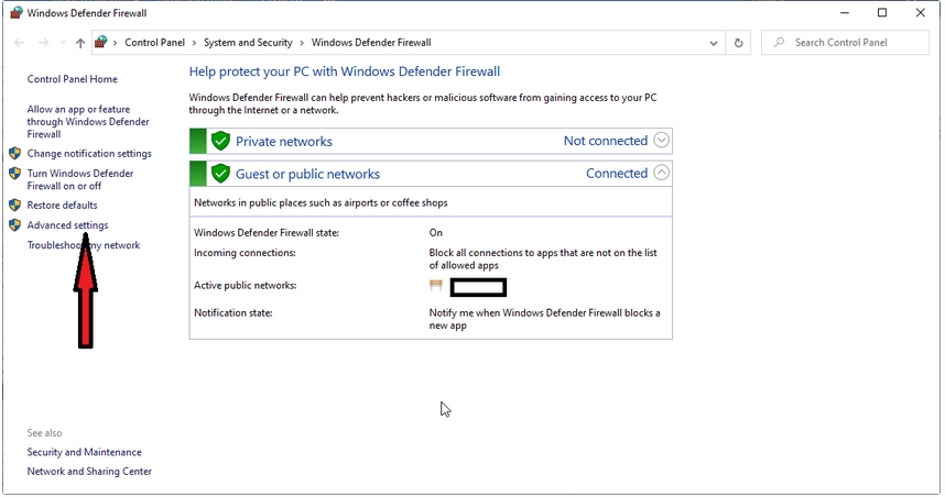 Otvorite "Windows Firewall", odaberite "Advanced settings" s lijevog bočnog izbornika: