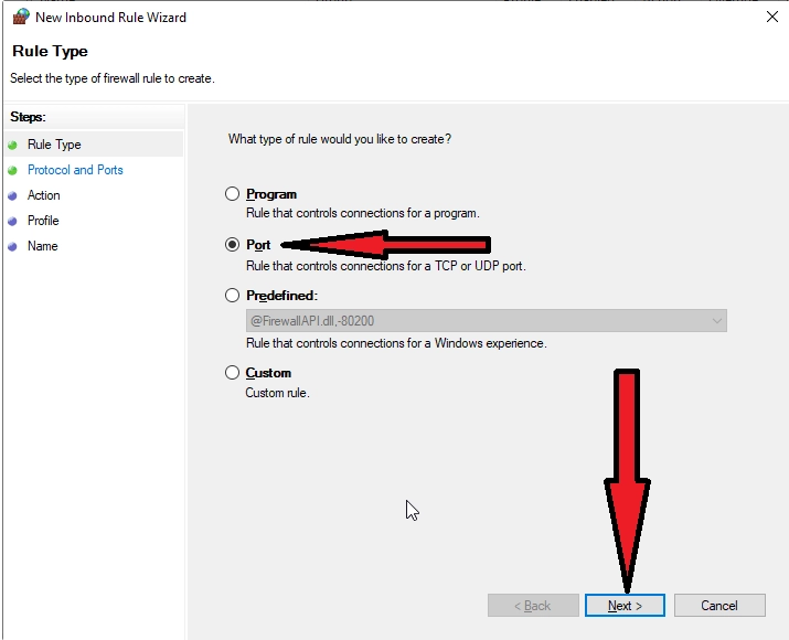 Otvorit će se čarobnjak za stvaranje pravila, u kojem trebate odabrati vrstu pravila "For Port" i kliknite "Next >"