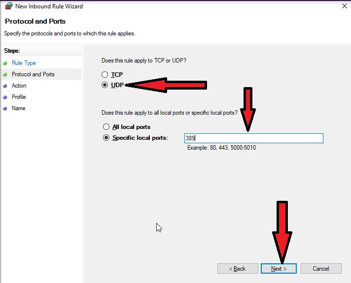 Na sljedećoj stranici, odaberite "UDP Protocol" i pod "Specific local ports" upišite 389 i kliknite "Next >"