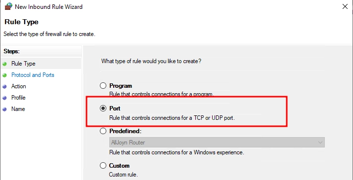 Dalje, naznačavamo port koji ste specificirali u točki 3, pravilo koje će se primjenjivati na veze s ovim portom, vrste mreže (samo lokalno ili vanjsko također) i naziv za pravilo.