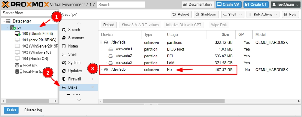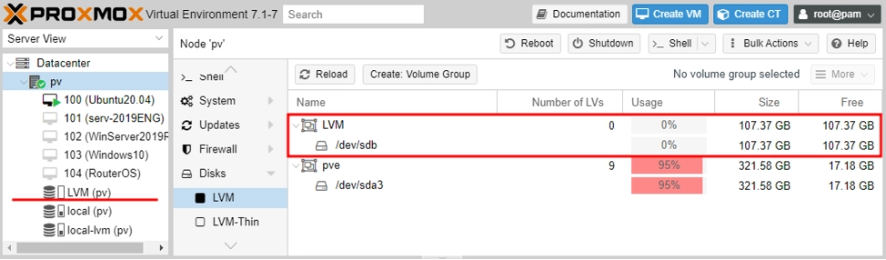 Postoji nekoliko opcija za povezivanje neiskorištenog pogona u Proxmox-u. Jedan od najbrži načina je povezati pogon kao LVM, gdje možete pohraniti VM i container disk slike.