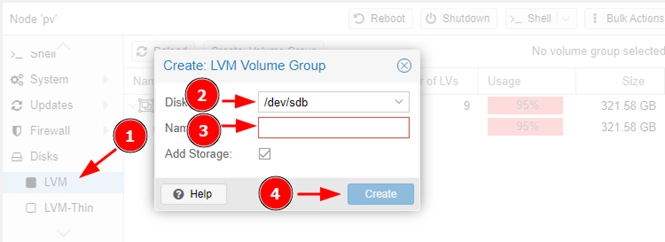2. Idite na odjeljak Disks/LVM, kliknite Create: LVM Volume Group, odaberite disk i navedite naziv pohrane