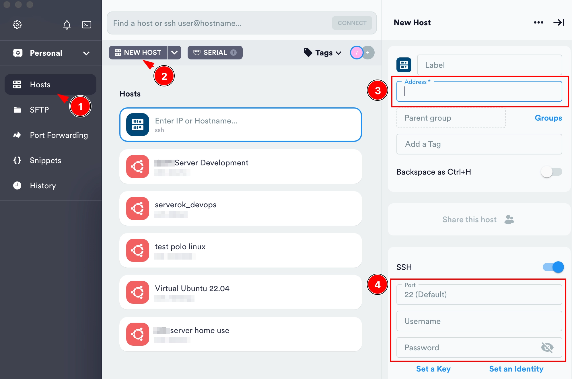 1. Kreirajte prvu vezu. U odjeljku Hosts, kliknite New Host. Popunite Address (adresa ili naziv domene vašeg servera), Username i Password polja. Promijenite Port polje ako je standardni SSH port 22 promijenjen na serveru. U Label polju možete postaviti prepoznatljivo ime servera.