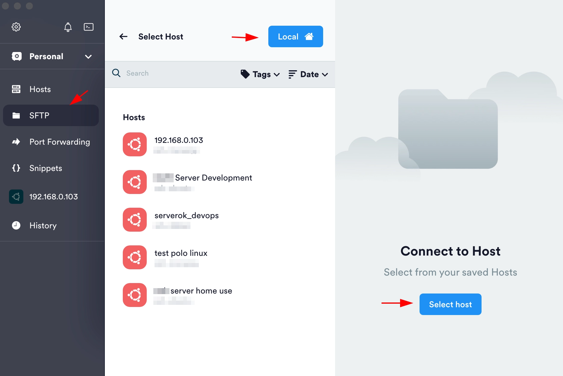 Možete se povezati na server korištenjem gumbova Select host na obje kartice. Vaši spremljeni domaćini s kojima ste konfigurirali ssh vezu dostupni su za odabir. Također je moguće otvoriti lokalnu pohranu (Local gumb) datoteke na jednoj od kartica i razmijenjivati datoteke između vašeg Mac-a i servera.