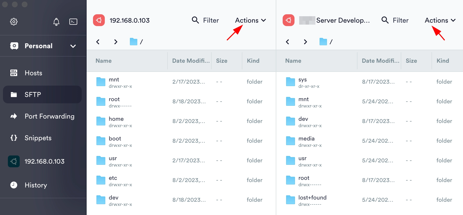 Na SFTP kartici dostupna je opcija za povezivanje na servere korištenjem SFTP protokola. Utility omogućava dvoprozorani način rada klasičnog upravitelja datoteka, gdje lijeva kartica otvara datotečni sustav jednog servera, a desna kartica otvara datotečni sustav drugog. Možete kopirati i premještati datoteke između servera.