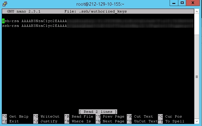 - Da biste to učinili, povežite se na njega putem SSH veze koristeći lozinku i otvorite datoteku .ssh/authorized_keys u početnom direktoriju korisnika. Sljedeći unos mora se dodati na kraj datoteke.