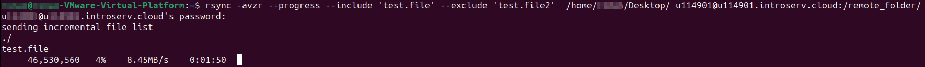 rsync -azr --progress --include 'test.file' --exclude 'test.file2' /home/user/Desktop/ boxxxx@boxxxx.introserv.cloud:/remote_folder/