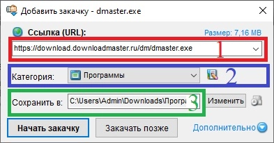 U ovom prozoru će biti već navedena adresa veze za preuzimanje (1), za grupiranje datoteka možete odabrati kategoriju preuzete datoteke (2), možete specificirati lokaciju gdje spremi datoteku (3) (pritiskom na gumb promjene možete specificirati lokaciju koju trebate). Kada unesete sve potrebne podatke u sva polja - pritisnite "Start download" i datoteka će biti preuzeta odmah. Ako kasnije kliknete na upload, veza za preuzimanje će biti dodana u Download Master, ali preuzimanje će biti pazirano.