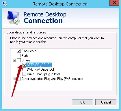 - Zainteresirani smo za 3. gumb sa snimke ekrana. U prozoru koji se pojavljuje, otvorite popis diskova i odaberite onaj koji planirate učiniti dostupnim putem RDP-a.
