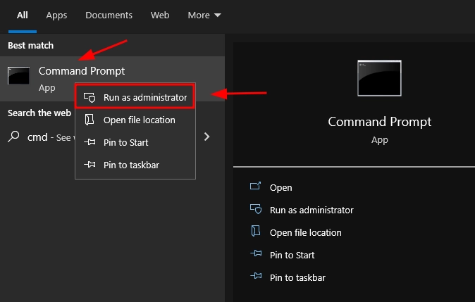 Start->Unesite "cmd"->Pronađite "Command Prompt"->Desnom tipkom miša kliknite->Run as Administrator.