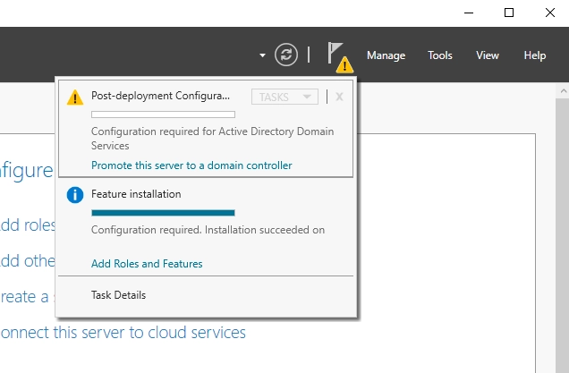 Nakon što je instalacija domenskih usluga dovršena, kliknite na žuti uzvičnik pored kartice "Manage" na glavnoj stranici Server Manager-a.