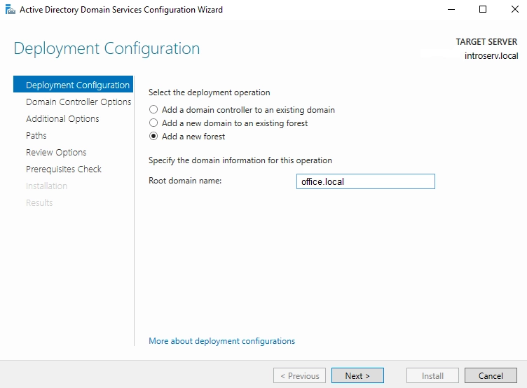 1. Na kartici "Deployment Configuration", odaberite operaciju primjene - Add a new Forest i dodajte naziv glavne domene naše organizacije. Napomenite da: