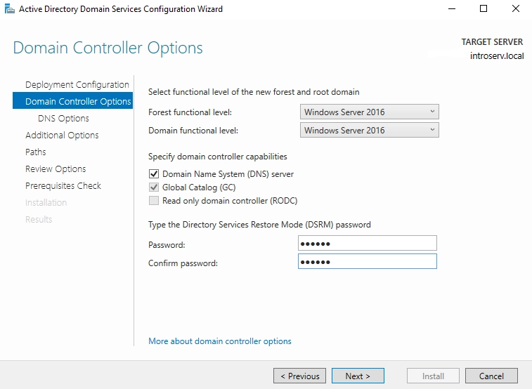 2. Na kartici Domain Controller options, ostavite zadane kvačice odabrane. Unesite lozinku. Nakon toga, kliknite "Next".