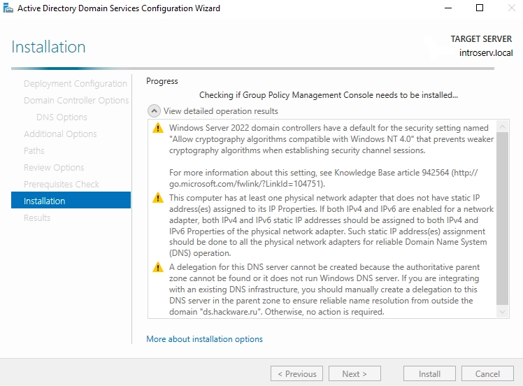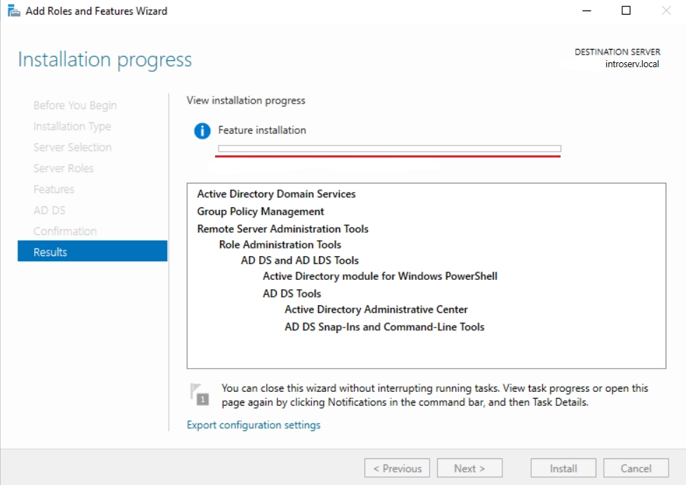 9. Nakon potvrde, vidjet ćete prozor s napretkom instalacije domenskih usluga.