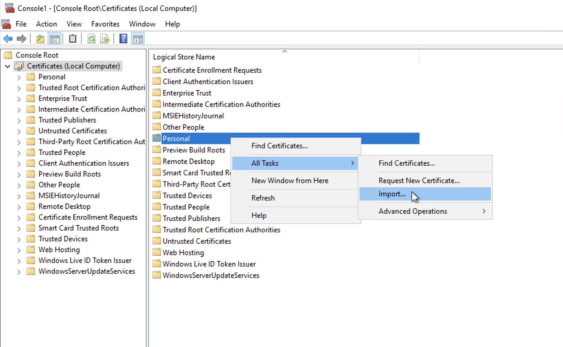 Sada se datoteka domain_name.pfx može učitati u Windows. Da biste to učinili izvršite: