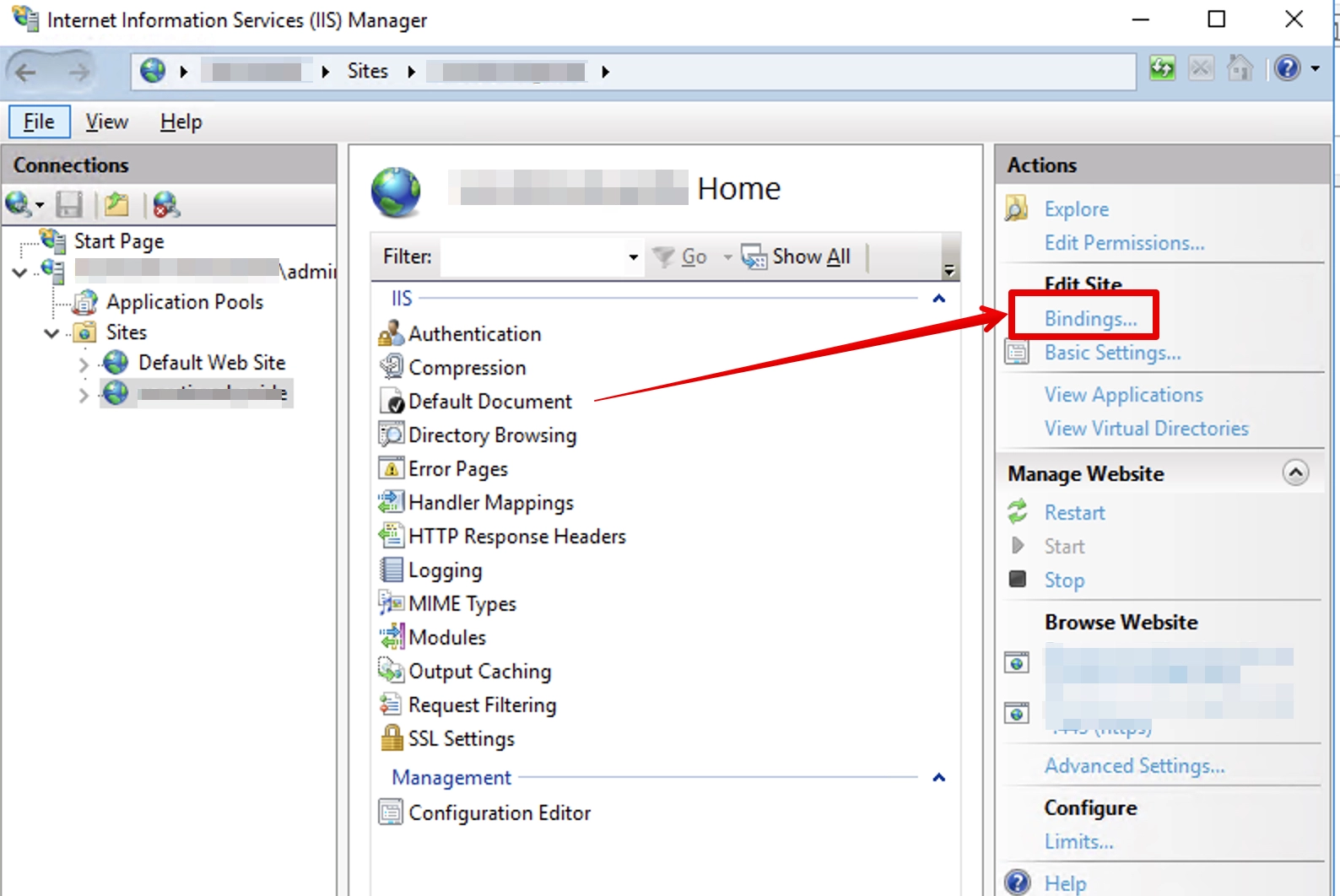 Otvorite IIS i odaberite željenu web stranicu i odaberite "Bindings":