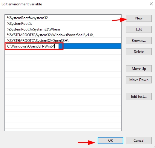 3) U prozoru koji se otvara, kliknite na "New" i unesite putanju direktorija OpenSSH iz koraka 1, u ovom primjeru: "C:\Windows\OpenSSH-Win64"