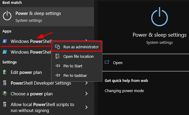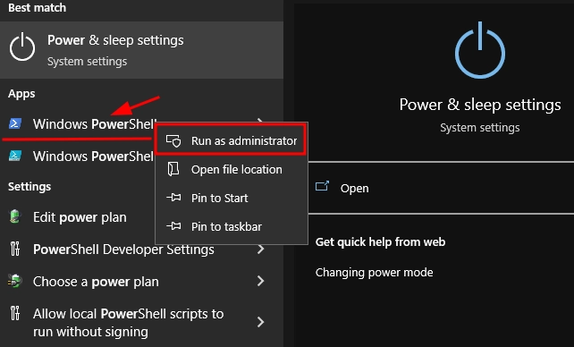 Start, upišite "PowerShell"→ Desnom tipkom miša kliknite na "PowerShell" → Run as Administrator