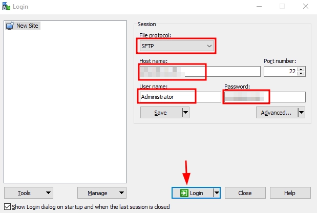 U prozoru postavki veze, odaberite SFTP protokol prijenosa datoteka, specificira naziv servera i detalje Windows računa pod kojima se povezujete