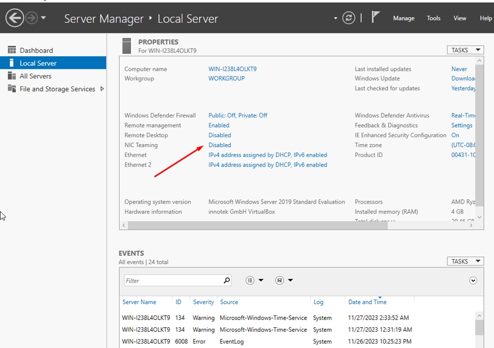 Na kartici Local Server, pronađite vaše mrežne adapter u odjeljku NIC Teaming (Ako odjeljak nedostaje, ovo može zahtijevati instalaciju dodatnih uloga, kao što je Hyper-V). Kliknite na Disabled pored NIC Teaminga da otvorite čarobnjak za postavljanje.