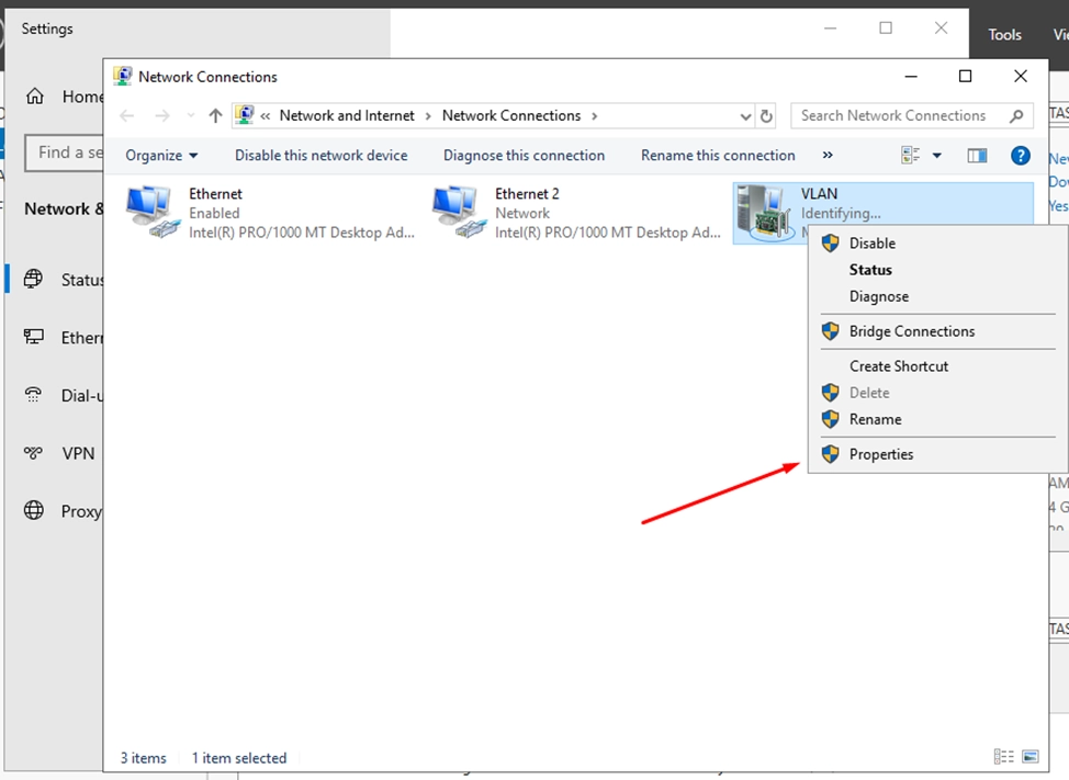 Desnom tipkom miša kliknite na VLAN mrežni adapter koji smo kreirali u prethodnim koracima koji želite konfigurirati za VLAN i odaberite Properties.