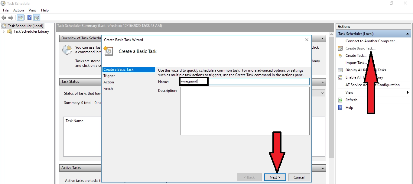 Kliknite na "Create simple task" → unesite naziv zadatka (npr. wireguard) → Dalje