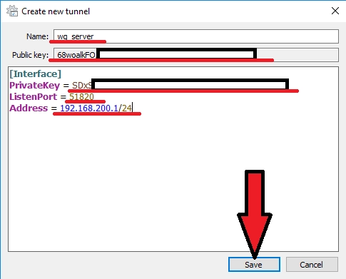 Pohranjujemo postavke: Name - naziv mrežne veze Public key - javni ključ WireGuard poslužitelja (potreban za konfiguraciju klijentske strane)