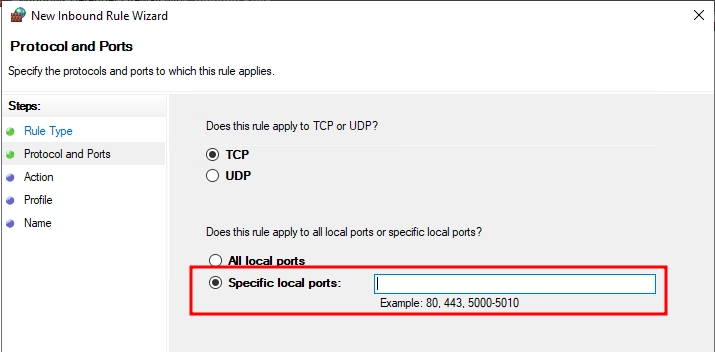 - U odjeljku "Protocol and Ports", odaberite vrstu protokola:
