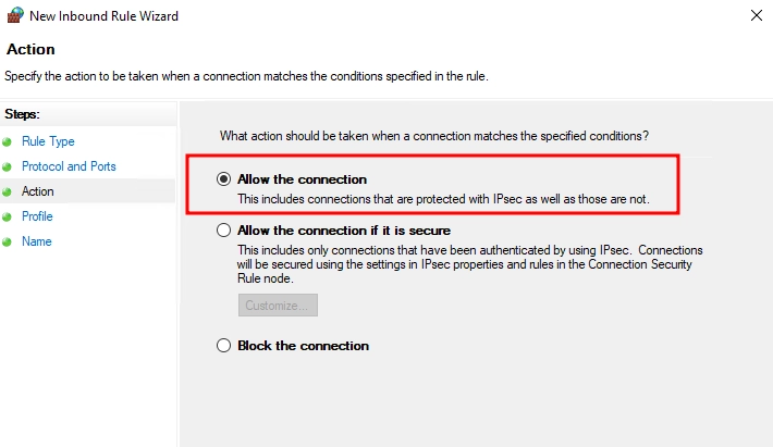 Dopusti vezu: U odjeljku "Akcija" odaberite "Dopusti vezu". Kliknite "Sljedeće". Spremite pravilo: