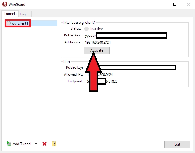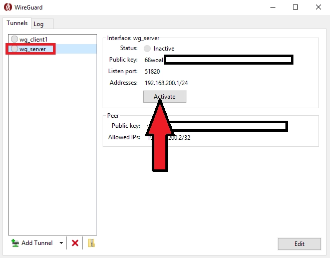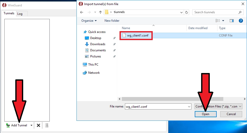 Zatim otvorite spremljenu arhivu, u njoj će se nalaziti konfiguracije svih naših tunela. Dajte klijentu njegovu konfiguracijsku datoteku. 7) Na poslužitelju odaberite konfiguraciju poslužitelja i pokrenite program. 8) Na klijentu dodajte konfiguracijsku datoteku u WireGuard. Dodaj tunel → Odabir konfiguracijske datoteke klijenta → Otvori.