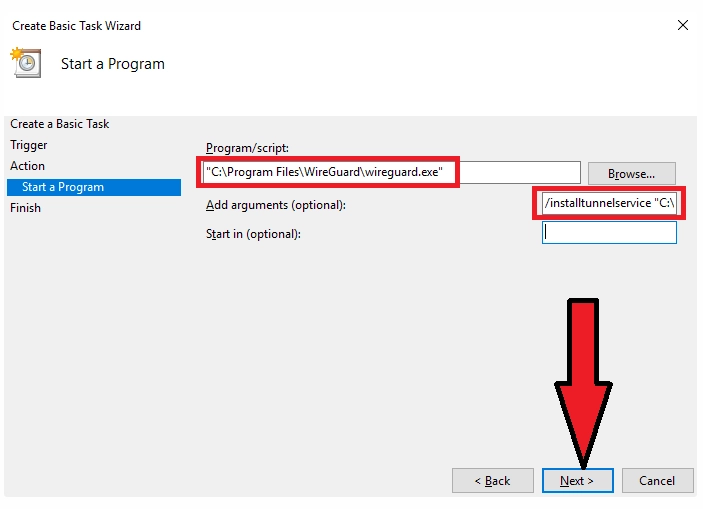 U polju "Program or Script", odaberite našu datoteku za pokretanje WireGuard-a (zadana je "C:\Program Files\WireGuard\wireguard.exe")