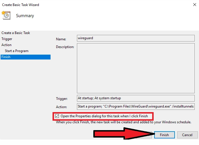 Označite "Open the Properties window for this task after you have clicked 'Done'"→ Done