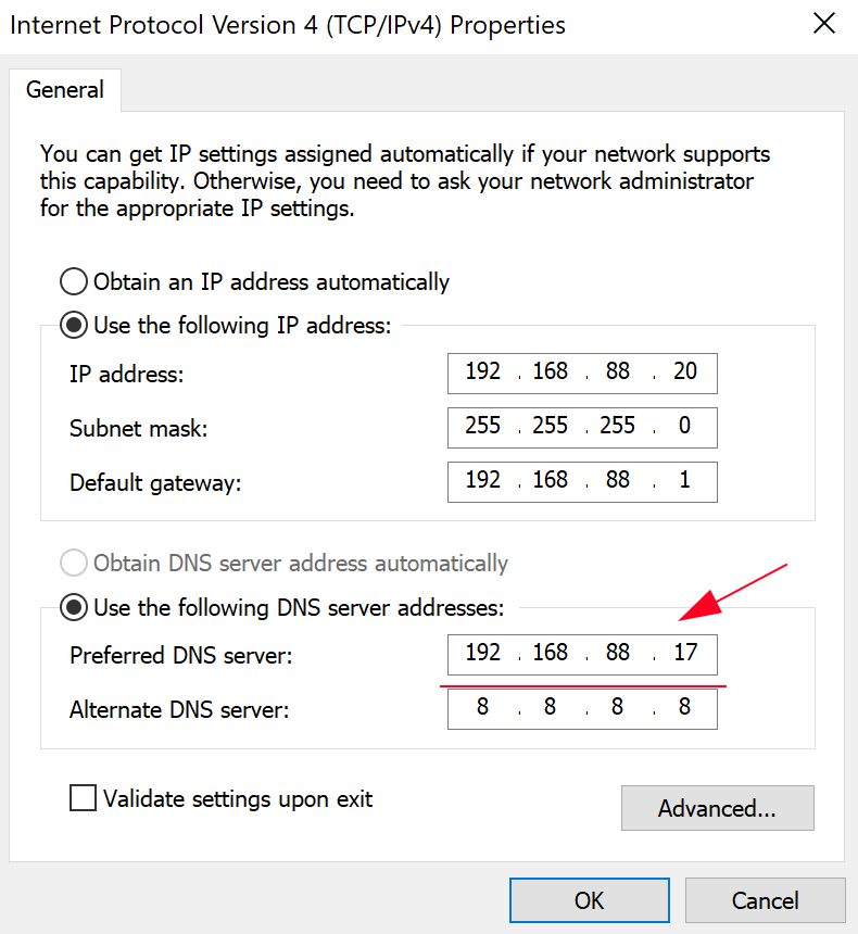 U polju Preferred DNS server unesite IP adresu vašeg Zentyal servera. Ovo je najkritičniji korak.