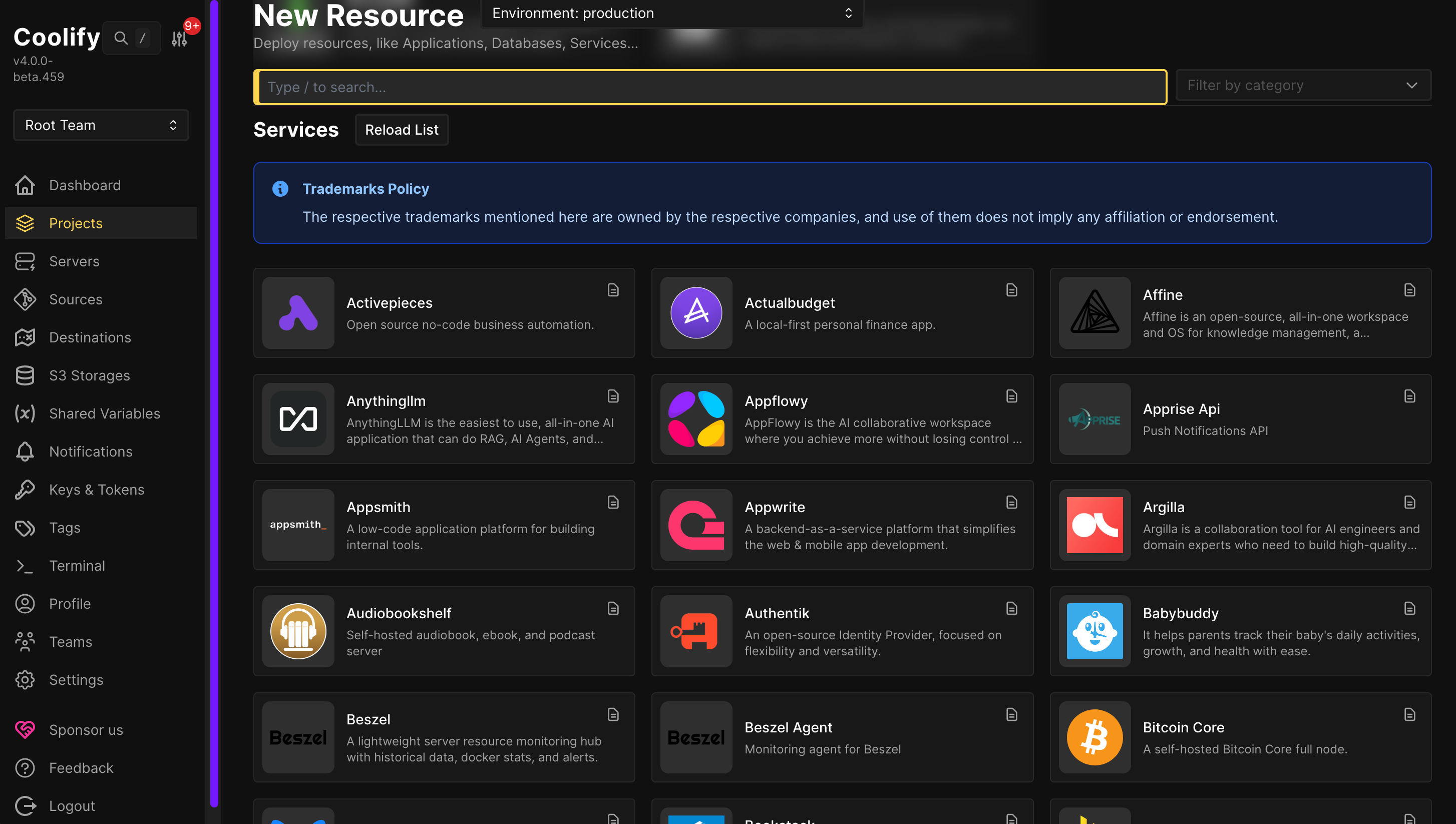 Coolify, da parte sua, offre un numero leggermente inferiore di servizi - circa 290 configurati - ma è di qualità nell'esecuzione e nella profondità dell'integrazione. Si tratta essenzialmente di un vero e proprio "app store" per il vostro server, dove ogni servizio non è solo un contenitore in esecuzione, ma un ambiente configurato in modo professionale.