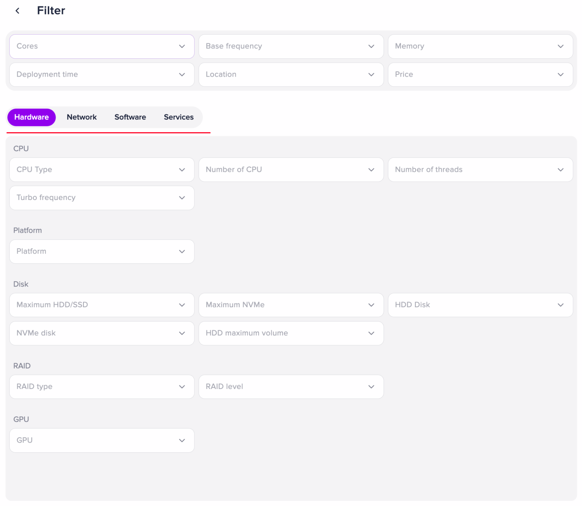 Inoltre, il pannello Filtro offre opzioni di filtraggio avanzate organizzate per schede: Hardware (tipo di CPU, numero di CPU, frequenza Turbo, piattaforma, opzioni disco, RAID), Software (Linux, Windows, virtualizzazione), Rete (velocità delle porte, numero IP, traffico, non misurato) e Servizi (IP-KVM e altre opzioni).